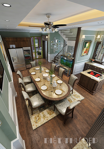 Tiếp đến là thiết kế nội thất không gian phòng bếp và bàn ăn liền kề. Thiết kế nội thất tân cổ điển nhấn mạnh vào đường nét và họa tiết trang trí cầu kỳ mang lại cho gia chủ cảm giác nhẹ nhàng và thanh thoát mang hơi hướng châu Âu cổ điển. Một trong chất liệu được kiến trúc sư ưu ái sử dụng chính là đá tự nhiên. Đây là một trong những chất liệu nhẹ được ưa chuộng những năm gần đây do tính linh hoạt và thẩm mỹ của nó. Đá tự nhiên với độ tương phản, tính mát giúp không gian trở nên tự nhiên, cân bằng sáng được đảm bảo.