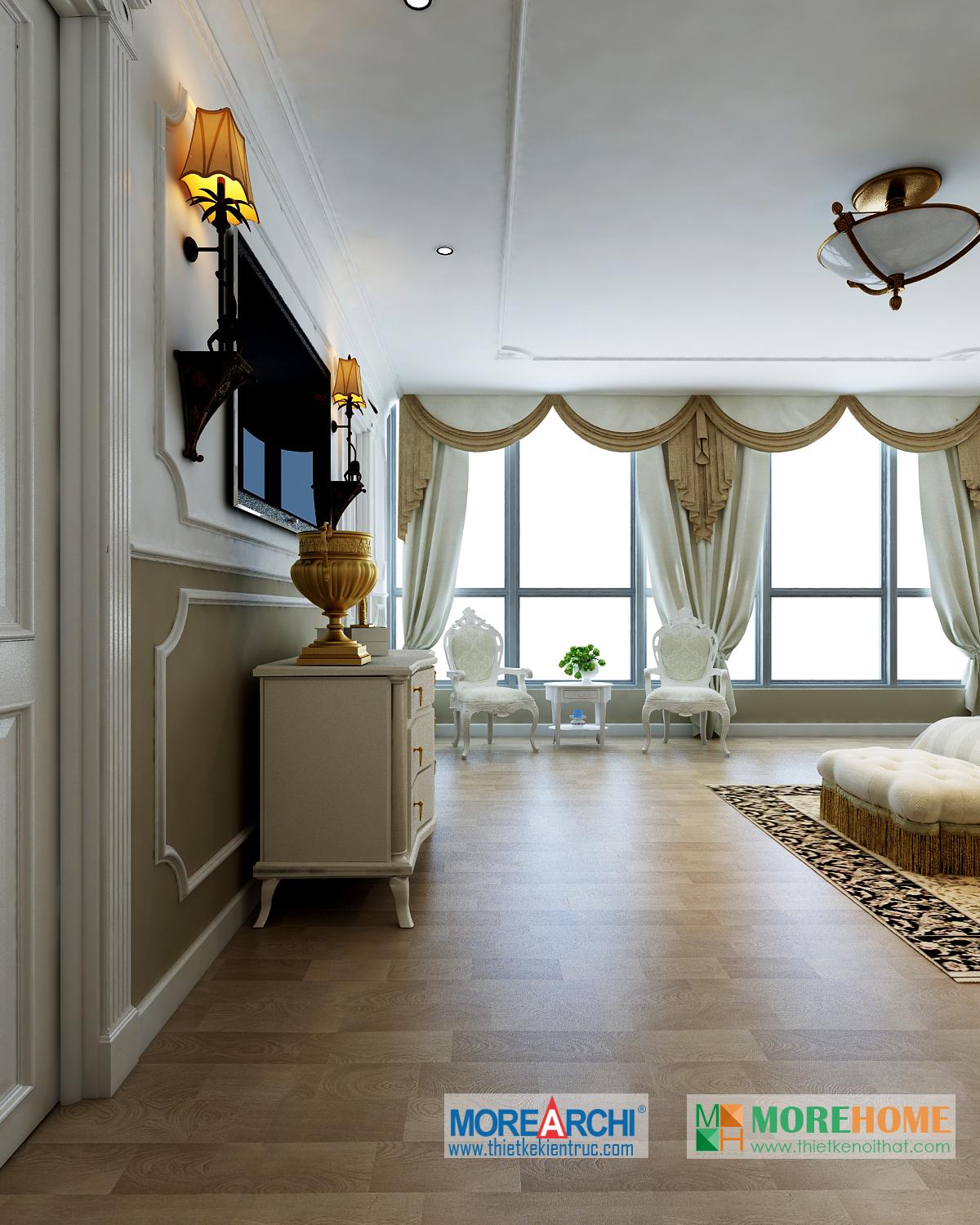 Một trong những điểm nhấn đáng chú ý của căn phòng là không gian hướng sáng khá nhiều. Thiết kế nội thất tân cổ điển chú trọng ánh sáng tự nhiên, tận dụng tối đa không gian hướng sáng mang đến sức sống cho không gian phòng và các khu sinh hoạt chung.